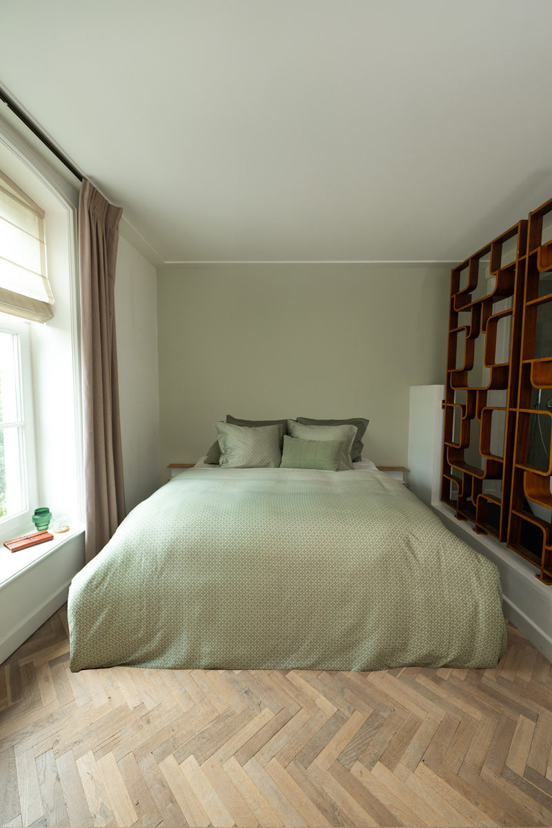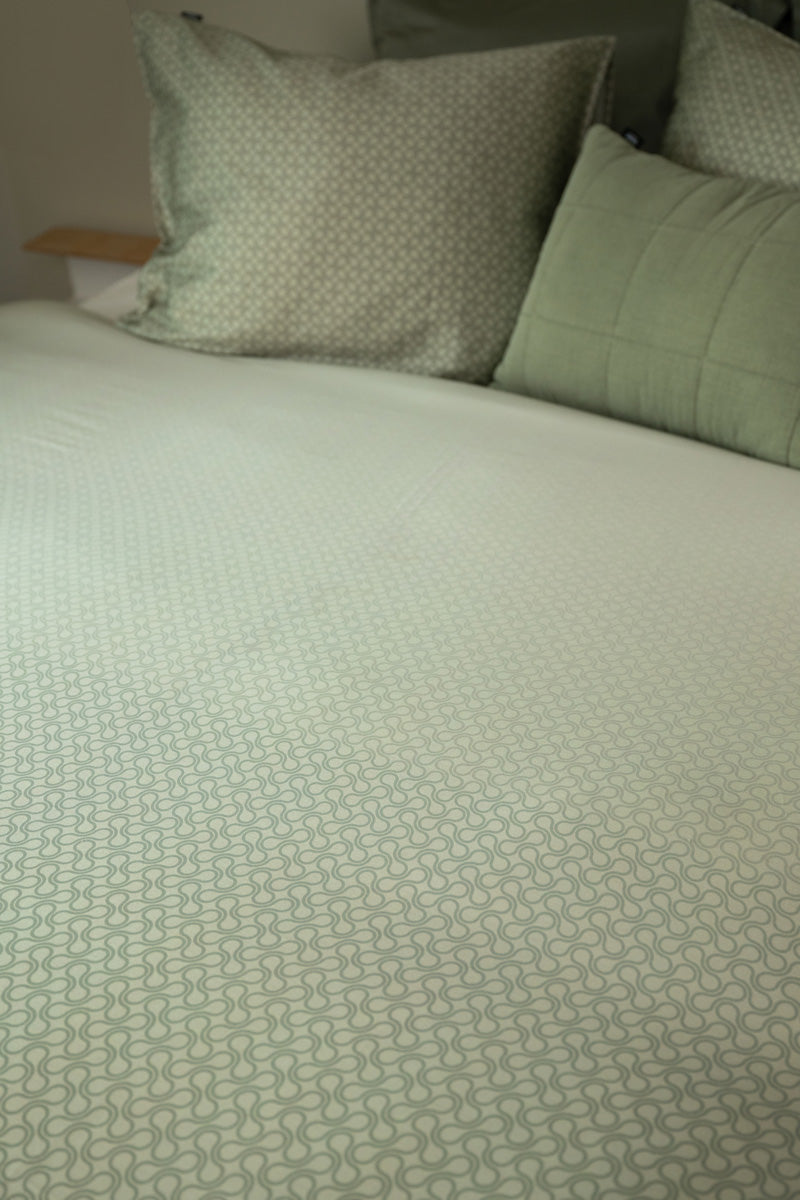 Rustig grafisch patroon in groen tinten. Het patroon heeft een kleur verloop van licht naar donkerder bij het voeteinde. Past makkelijk bij vele slaapkamers.