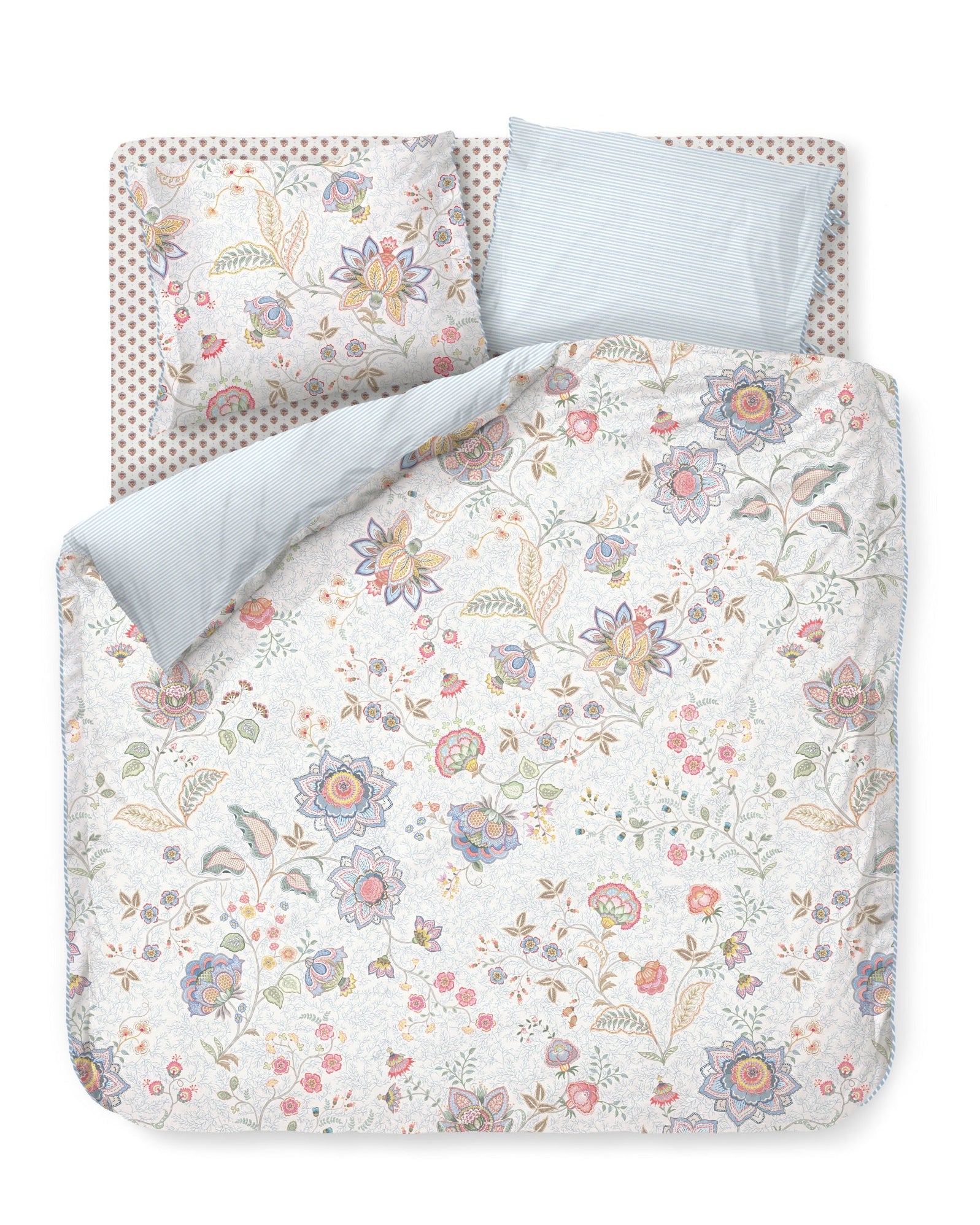 Dit Pip Studio dekbedovertrek Mumbai Morning combineert een bloemen dessin met kleine takje op een witte ondergrond. De achterzijde heeft een blue/wit fijn streepje. Gemaakt van 100% percal katoen: zacht, soepel en luchtig. De kussenslopen zijn afgewerkt met knoopjes en een sierlijke piping. Lengte: 260 cm met extra ruime instopstrook. Inclusief 1 of 2 kussenslopen.