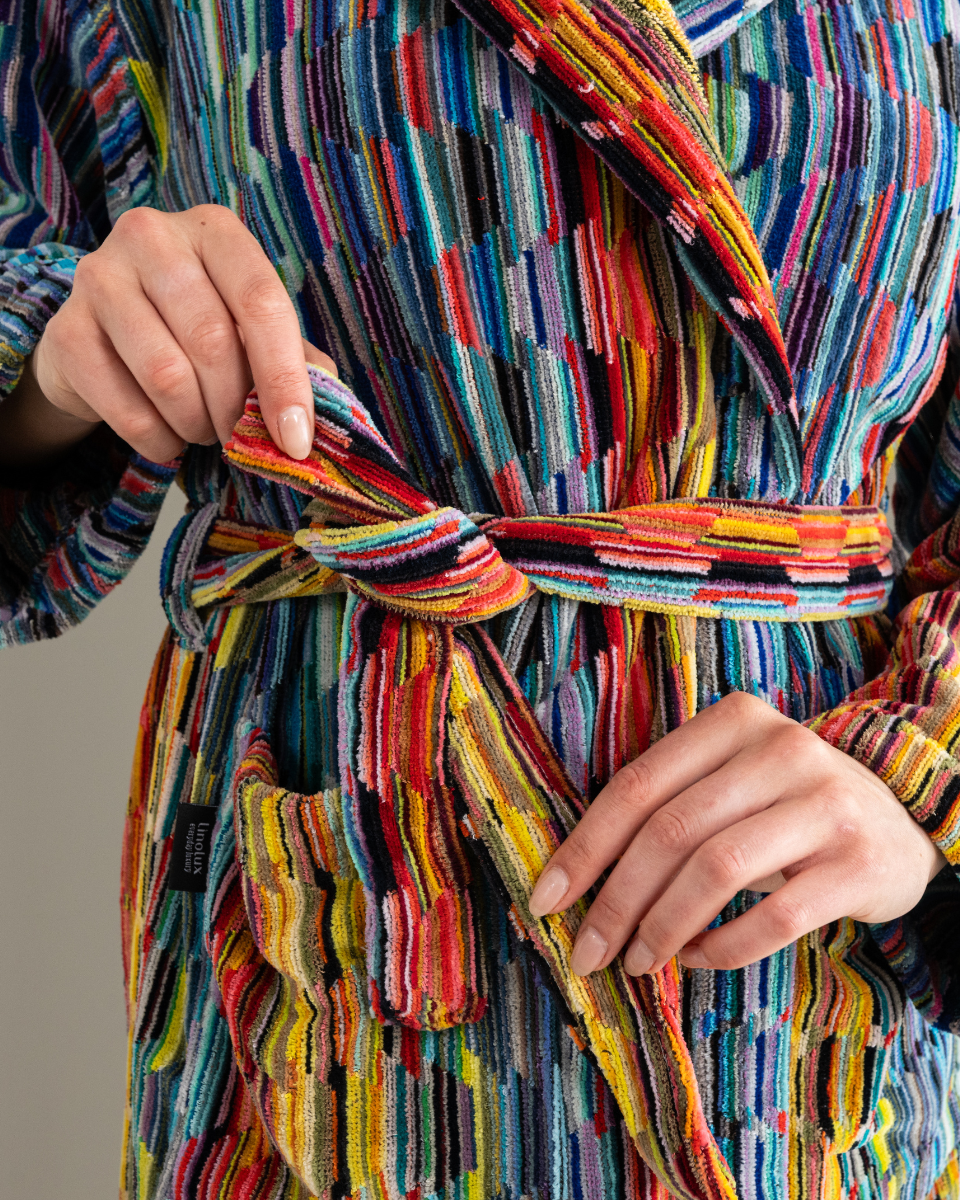 Linolux badjas Dante multi is gemaakt van een 100% katoenen velours met trendy ingeweven streepjes dessin. Luxe badjas met capuchon voor hem en haar. Met opgestikte zakken en ophang lus.
