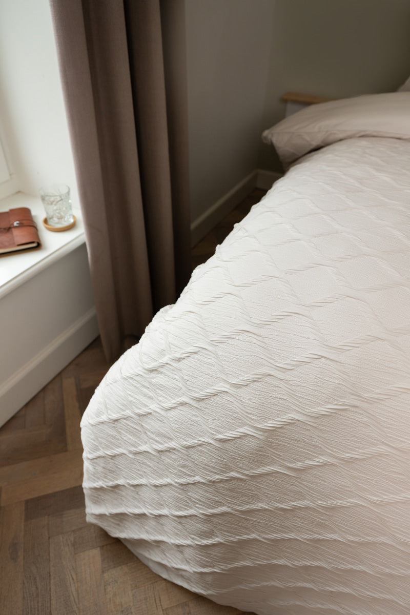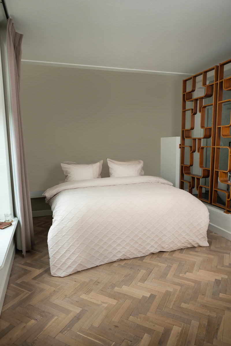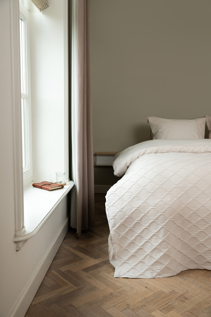 Overtrekset Cedar van Linolux heeft een elegante eenvoud. Mooie kwaliteit percal katoen 180 count in combinatie met structuur stof met ruit aan de bovenzijde all over, met een pipping afwerking. Ook de bijpassende slopen hebben een rand afwerking. De binnenzijde is glad percal katoen.