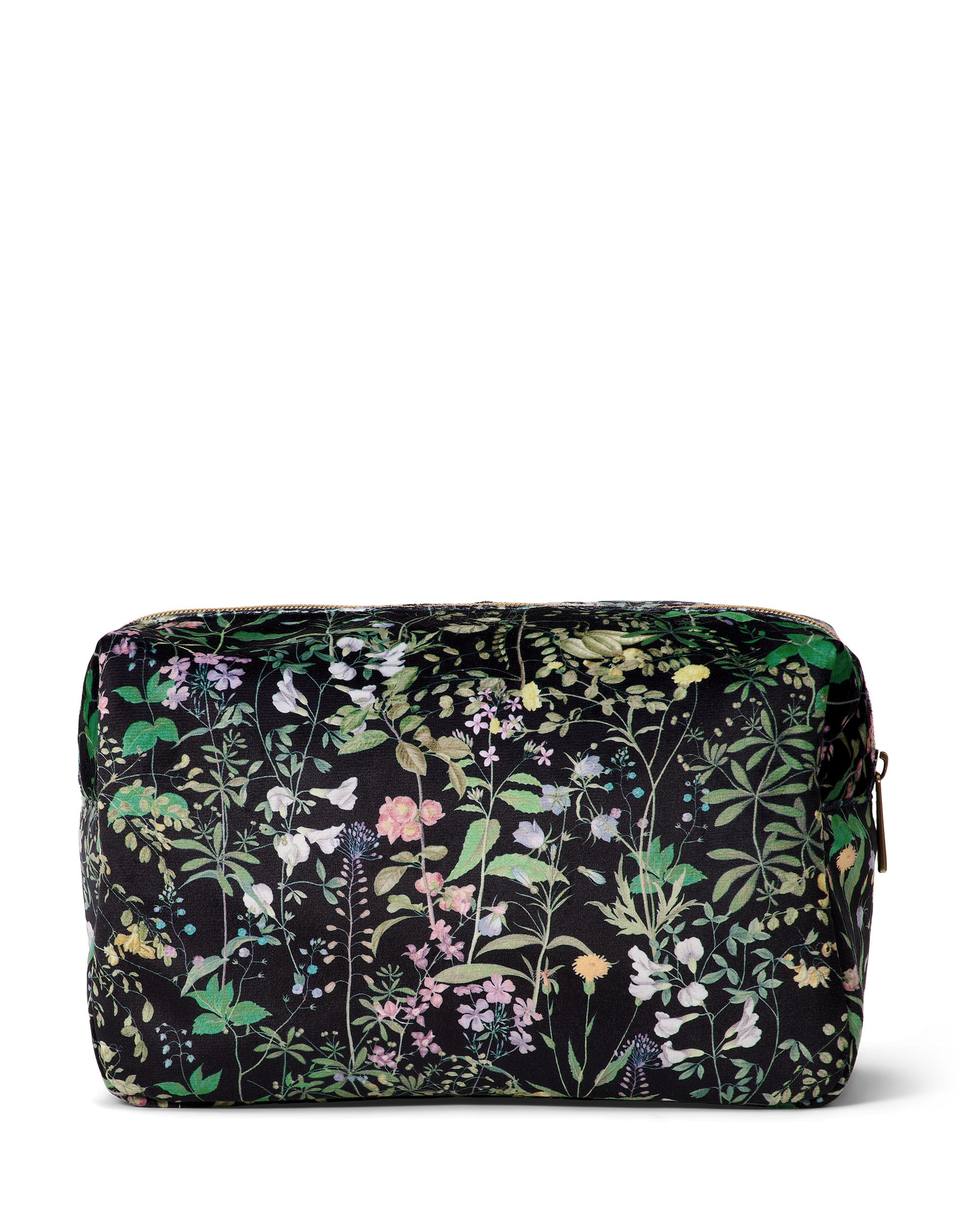 Leuke toilet tas van Essenza. Mooi fris bloem dessin op antraciet ondergrond. Er zitten diverse zakjes binnenin om makkelijk je toilet artikelen op te bergen. Binnenzijde groen in een kleur en rits is goud kleurig. Met lederlook Essenza label.